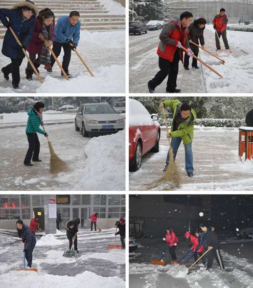 物业服务公司凌晨五点组织全体人员开始进行清扫工作,八点前将校园南北校区几条主干道积雪清扫完毕,并备齐除雪作业所需的工具提供给志愿者使用。学生工作处组织各学院学生志愿者按各自划分区域进行扫雪工作,共出动学生志愿者300余人次,圆满地完成了清扫任务。校工会也组织了部分教职工加入到扫雪铲冰志愿工作当中。后勤管理处组织人员对校园扫雪铲冰工作进行了全面协调和检查。