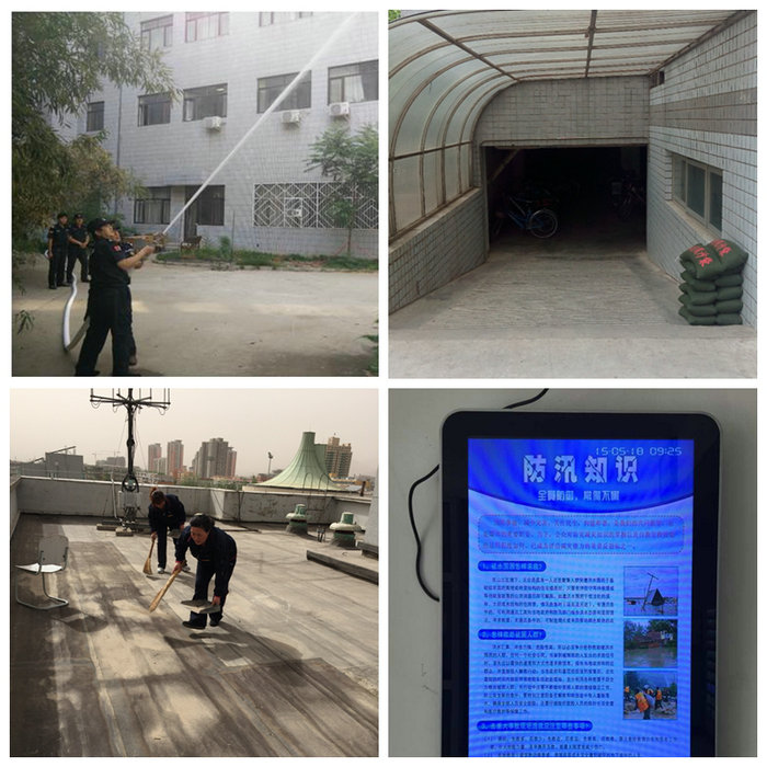 后勤管理处作为学校防汛工作的具体组织和实施单位,以提高汛期学校预防和应对突发灾害的能力为重点,对全校防汛重点部位进行了安全隐患排查,建立了《防汛安全隐患台账》;成立了防汛应急抢险队,在校园各重点防汛部位放置沙包、抽水设备、雨具等防汛物资;对《中国天天色天天(北京)防汛工作预案》进行了完善修订。后勤各实体公司均进行了安全隐患自查并制订了应对各类潜在灾害风险的应急预案。动力维修公司、公寓服务公司和润杰物业公司组织人员对校园建筑物屋顶、雨水口进行了全面清理,协助气象部门对楼宇避雷设施进行检测,确保汛期的校园安全。各学生公寓、食堂利用条幅、宣传海报、LED屏等,向学生宣传预防地质灾害、消防安全等知识。