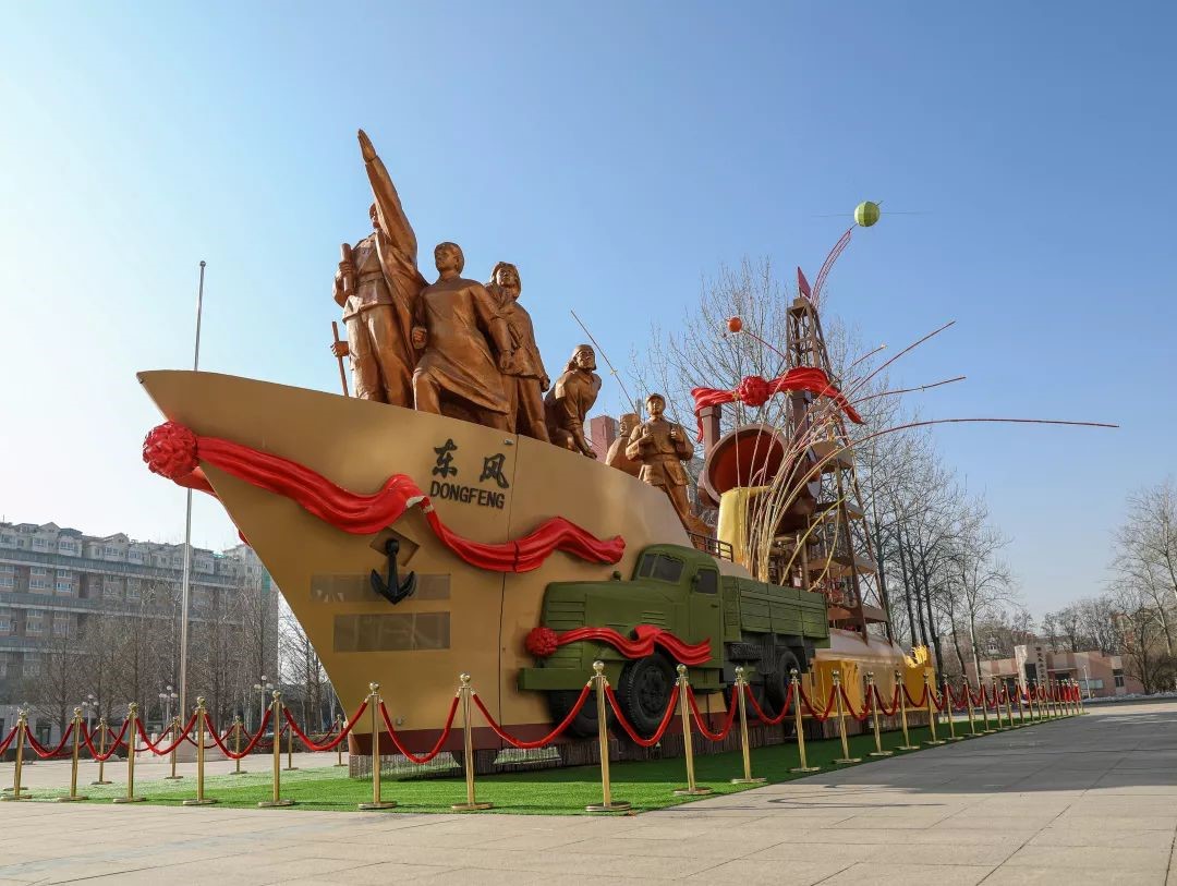 “艰苦奋斗”彩车展示中华儿女满腔豪情,在新中国一穷二白的基础上,自力更生、艰苦创业,我国社会发生了翻天覆地的变化,为中国发展富强、人民生活富裕奠定了坚实基础。彩车车头以王进喜、时传祥等劳模群雕为主体形象,车体由新中国第一艘万吨轮、第一辆解放卡车、第一辆东方红拖拉机和油田井架、“两弹一星”、丰收稻谷等构成,彰显建设社会主义时期的火热的建设场景和时代精神。