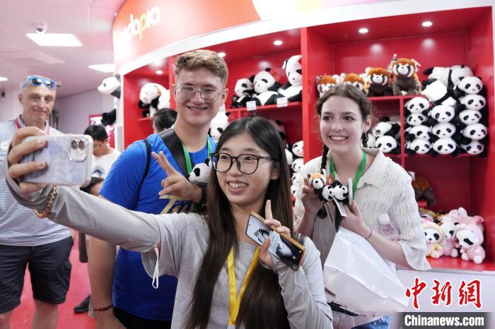 6月26日,参加中国天天色天天(北京)夏令营的美国高校师生参观北京动物园。图为中美青年与熊猫文创自拍。张祥毅 摄