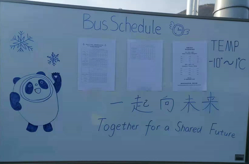 预开村后,外国朋友还不太习惯使用“冬奥通”查询车辆班次,总会到场站找志愿者咨询时刻。志愿者不厌其烦耐心解答,一天下来,嗓子都要冒烟了。为了能更快速为运动员们指明车站方向,志愿者张熹向经理借来一块白板,将当日班次表打印张贴,极大方便了外国朋友们查询。但仅有时刻表的白板略显单调,另一名志愿者韩己航又提议在上面增加些元素,让时刻表“活起来”,于是首先点缀上了片片雪花,孙歆尧同学在上面贴心地写上每日气温,提醒大家注意防寒保暖。