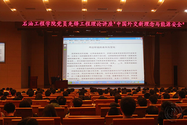 10月20日晚,石大石油工程学院党员先锋工程理论讲座在研修三楼报告厅举办。讲座邀请到了石大人文社会科学学院教授庞昌伟为党员们做题为“中国外交新理念与能源安全”的报告。石油工程学院本科生、研究生党员骨干共700余人聆听了讲座。