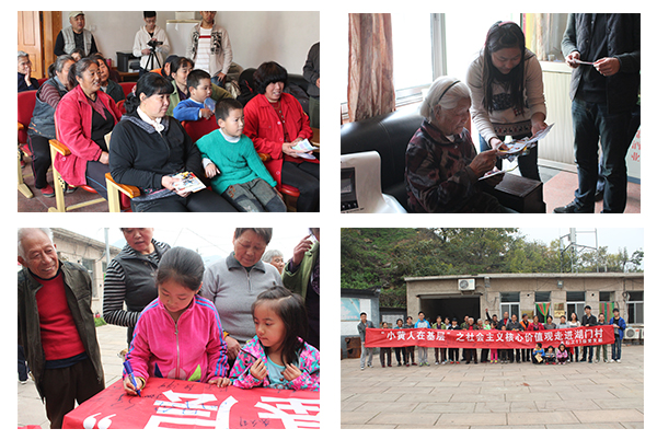 活动中,同学们以“幸福在湖门”为主题,从赴延寿镇湖门村暑期社会实践所记录下来的湖门村村民的点滴幸福生活切入,朴实地讲述了社会主义核心价值观与老百姓幸福生活千丝万缕的联系,并与村民们展开探讨,向他们普及了一些运用网络对农产品以及农家院进行宣传的知识。同学们还为村民们发放了社会主义核心价值观的宣传手册、DVD光盘及各种小礼物,为湖门村搭建了“社会主义核心价值观”文化宣传墙,获得了村民的一致欢迎。