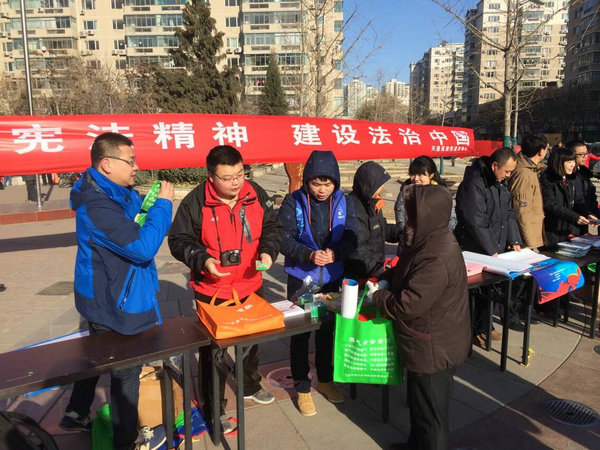 在国家第一个宪法日到来之际,12月4日,石大青年志愿者协会数名志愿者前往天通苑南街道社区,和当地青年汇成员一起参加了由天通苑南街道办事处举行的普法宣讲活动。志愿者在社区广场张贴海报,向居民宣传法律知识,派发法律书籍,随机进行街头采访和问卷调查。