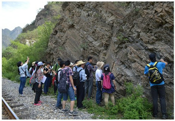 5月30日上午,在石大地球科学学院教师高岗与吴欣松的带领下,6所高校共25名学生乘车赴北京门头沟下苇甸进行野外地质考察。门头沟下苇甸地区位于妙峰山区域,地层发育较全,露头特征具有典型性和代表性。同学们在教师指导下对该区青白口系至上寒武统地层剖面以及主要岩性特征与结构构造特征进行了观察,并对该区典型的褶皱、断裂等构造现象进行了分析。