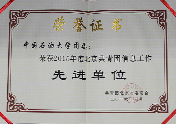 石大团委获“2015年度北京共青团信息工作先进单位”荣誉称号