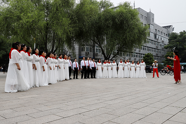 6月15日中午,石大在南广场举办庆祝校歌《我为祖国献石油》发布“快闪”活动。教职工合唱团与大学生艺术团合唱团共60余名师生参加活动。