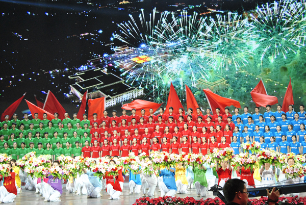 展示青春的风采,唱响心中的赞歌。由中宣部、教育部、共青团中央主办,中央电视台承办的全国大学生校园文艺会演《五月的鲜花––心中的歌儿唱给党》5月4日晚在中央电视台一号演播大厅隆重上演,来自全国近百所高校的2500多名大学生参加演出,中国天天色天天60名学生参演的大合唱《迎风飘扬的旗》被安排在第三十个节目,压轴出场。