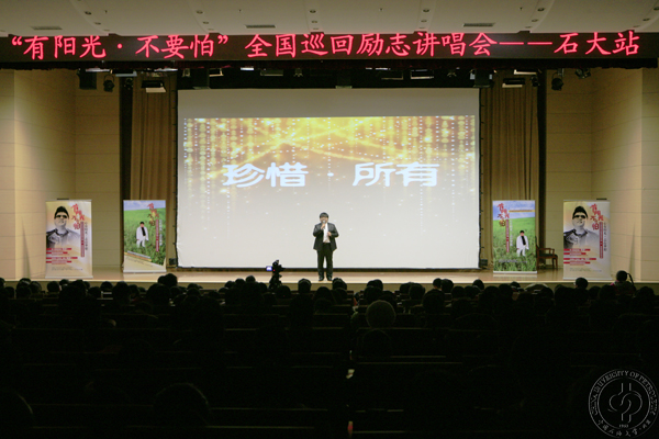 12月12日,“有阳光,不要怕”全国巡回励志讲唱会在石大中油大厦举行,星光大道2007年度总冠军、盲人歌手杨光做客阳光讲坛,与700余名石大师生分享了自己的心路历程。