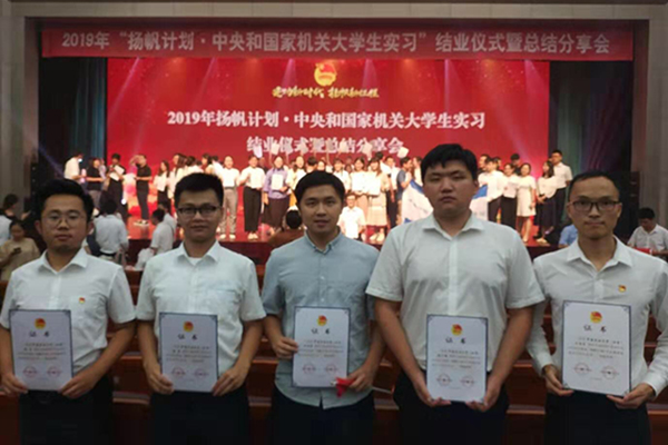 8月15日,2019年“扬帆计划·中央和国家机关大学生实习”结业仪式暨总结分享会在共青团中央南楼礼堂举行,石大5名硕士研究生参加并在会上分享实习感悟。
