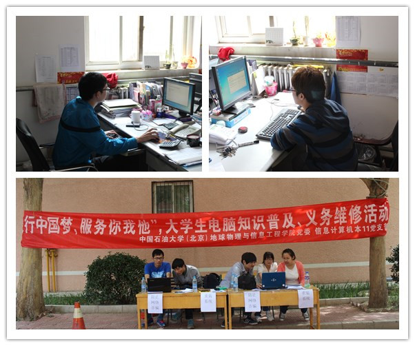 为进一步巩固和扩大党的群众路线教育实践活动成果,建设服务型基层党支部,4月27日,石大地球物理与信息工程学院计算机本2011党支部前往昌平区亢山佳园社区,开展“践行中国梦,服务你我他”电脑知识普及、义务维修进社区红色“1+1”活动,为广大居民提供便利。