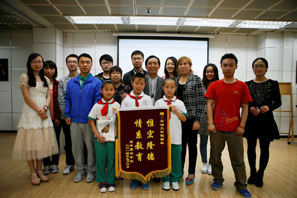 5月12日下午,石大陶笛社在音乐教室举办义务支教经验交流会。昌平农民工子弟学校雨竹小学的师生们专程来学校为陶笛社送上了“惟宏隆德,情系教育”的锦旗。雨竹小学高秀芳代表雨竹全校师生,感谢陶笛社的同学们三年多来风雨无阻为学校的孩子们教授陶笛。她说:“陶笛增加了孩子们的自信,成就了他们的音乐梦想。三年多来,雨竹小学陶笛班的同学们参加了许多演出和活动,得到了社会、家长和许多公益组织的高度认可。三年多来,石大陶笛社的同学们虽然换了一批又一批,但是为雨竹小学的义务支教始终没有停止,爱心接力一直在进行。现在,五年级的孩子们已经具备了一定的演奏水平,还准备参加今年夏天的全国陶笛比赛。”