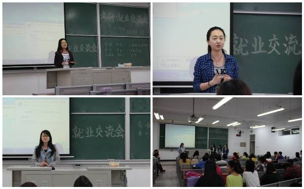 本次交流会包括考研、就业和留学3个部分。易唯、易彩分享了考研路上如何在校内与校外、本专业与跨专业、学术性与专业型等选择中权衡取舍;王媛媛分享了如何成功就业的经验,别对保研与就业的取舍,国企、公务员与外企的对比,就业简历与面试技巧等方面进行了讲解;蔡晓珺分享了普华永道实习生应聘经验与技巧以及到加州大学圣塔芭芭拉分校出国留学的申请历程等。