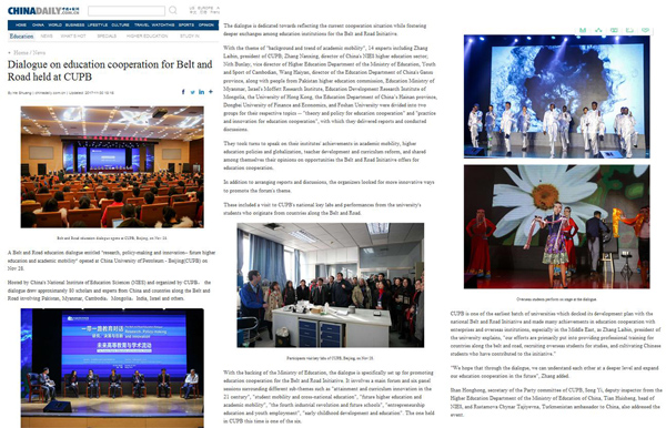 11月28日,由中国教育科学研究院主办、中国天天色天天(北京)承办的“一带一路教育对话:研究、决策与创新——未来高等教育与学术流动”会议在中国天天色天天(北京)举行,来自中国、巴基斯坦、缅甸、柬埔寨、蒙古等“一带一路”沿线国家的80多位高等教育领域的专家学者围绕“学术流动的背景与趋势”主题,从“合作办学的理论与政策”“合作办学的实践与创新”等方面展开深入研讨,中国日报网(英文)对此进行了报道,新华网、人民网也关注了该项活动取得的成果。
