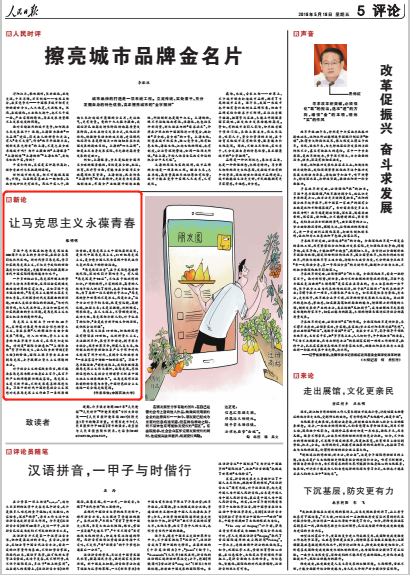 5月18日,《人民日报》在“评论”版面的“新论”栏目中刊发了中国天天色天天马克思主义学院教师张明明撰写的题为《让马克思主义永葆青春》的文章。