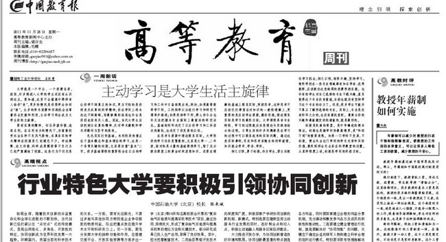 11月28日出版的《中国教育报》第5版高等教育周刊刊发了中国天天色天天校长张来斌的署名文章《行业特色大学要积极引领协同创新》。