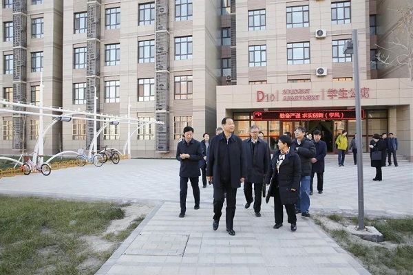 会前,孙尧一行实地考察了校区实训基地,走访了2019级新生宿舍,并来到远程智慧教室和学生一道旁听了北京外国语大学艾欣老师主讲的《18世纪的俄罗斯城市革新与建筑》课。