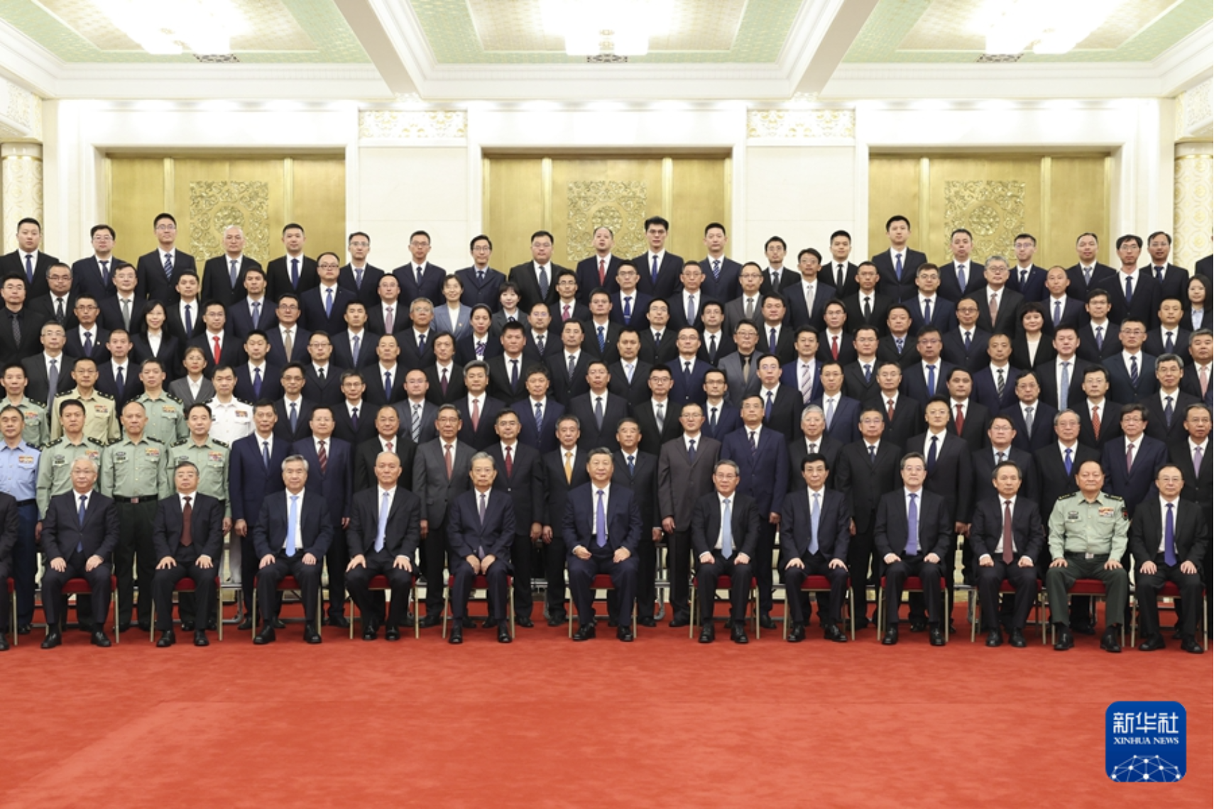 在人民大会堂北大厅,习近平等同大家亲切握手,并合影留念。