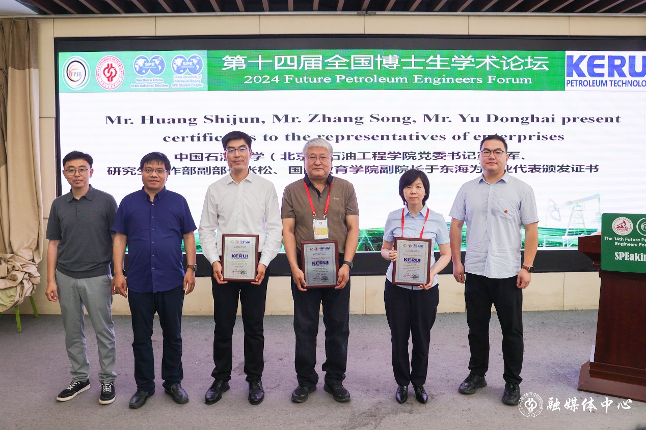 周东波代表SPE北方分会向本届全国博士生学术论坛的召开表示祝贺,鼓励参赛选手激发创新激情、拓宽学术视野,并祝愿论坛越办越好,进一步带动未来能源产业蓬勃发展,助力“双碳”目标实现。石油工程学院党委书记黄世军、学生工作部研究生工作部副部长张松和国际教育学院副院长于东海为企业代表颁发了赞助证书。