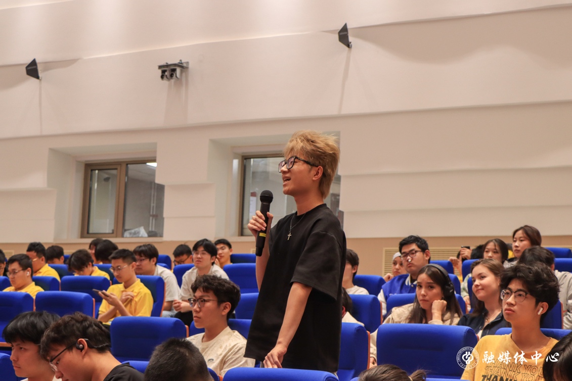 李晔分享了自己在戏剧创作中的心得体会,通过回顾经典角色的塑造过程、现场示范表演等,深入剖析了演员如何通过细节打磨角色,将剧本中的文字转化为有血有肉的人物表演。谈及戏剧的魅力时,他动情地说:"剧场是美育最生动的课堂,在这里,人与人的直接交流创造着瞬间的永恒。演员与观众共同呼吸的审美体验,是任何数字技术都无法替代的。"他特别提到,在当代高校美育体系中,剧场艺术具有三大不可替代的价值:培养共情能力、提升审美素养、激发创新思维。