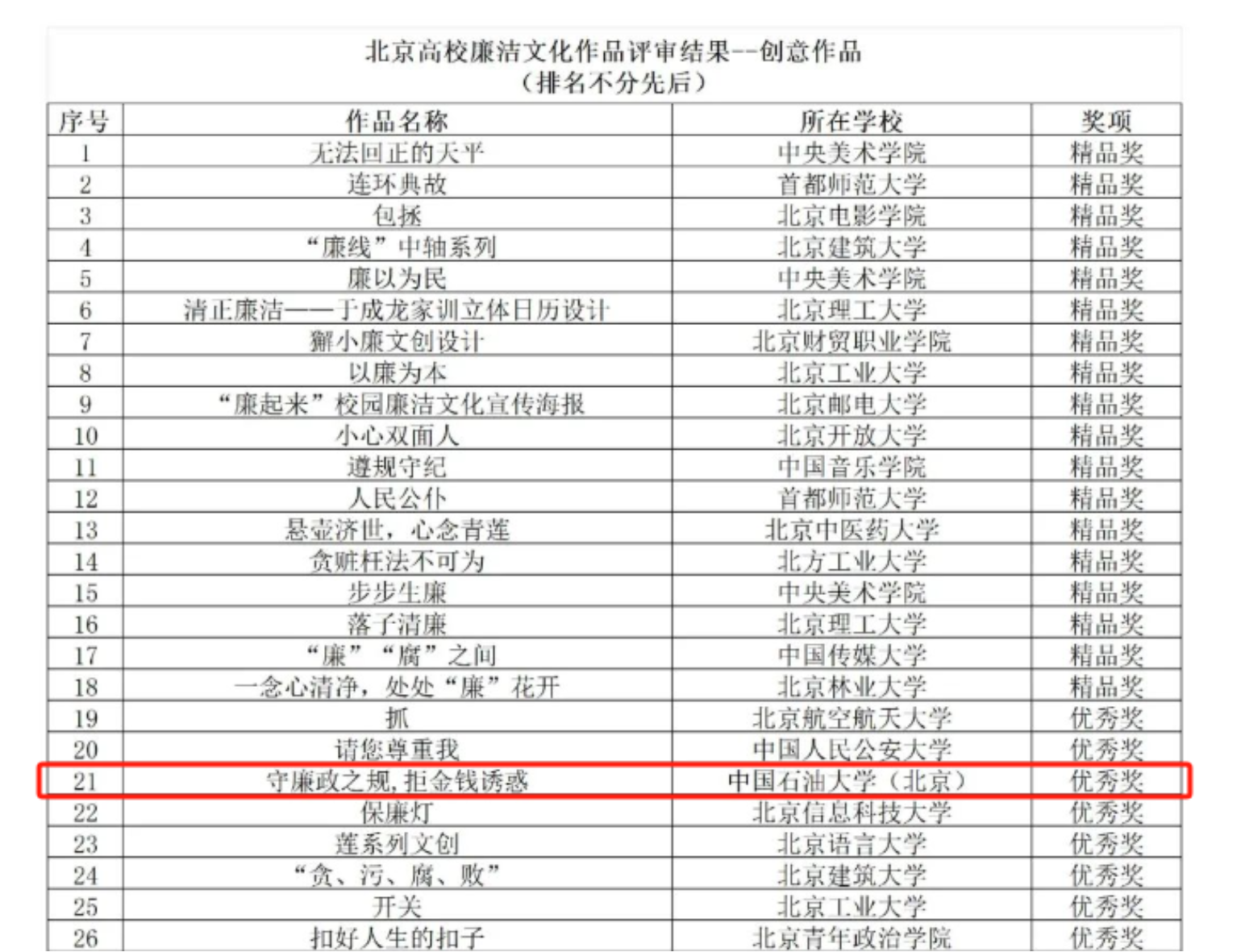 马克思主义学院教师冯文燕主讲的网络微课“历览前贤国与家,成由勤俭破由奢”入选第九届高校廉洁教育系列活动“一校一金句”网络微课,期刊社教师郑秀娟创作的散文“磊落一生只为国”获评北京高校廉洁文化作品(故事作品)优秀奖,石油工程学院研究生钱春龙设计的作品“守廉政之规,拒金钱诱惑”获评北京高校廉洁文化作品(创意作品)优秀奖。