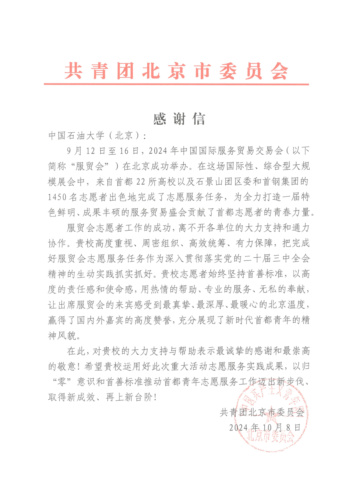 北京团市委来函致谢中石大服贸会志愿服务保障工作