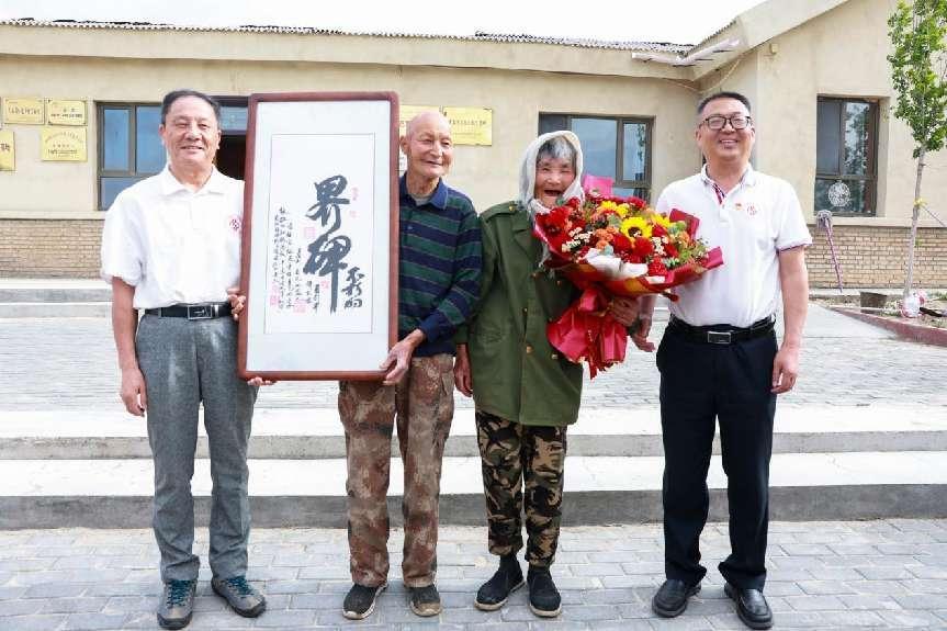 5月19日上午,实践团一行来到“七一勋章”获得者魏德友家里,看望慰问魏德友夫妇,感悟兵团精神。“家住路尽头,屋在国界旁,种地是站岗,放牧为巡边”,1964年至今,魏德友、刘景好夫妇像是行走的“夫妻岗哨”,把自己“种”在萨尔布拉克草原上,坚守边境60年,践行“一生只做一件事,我为祖国守边防”的誓言。观看老人的事迹影片,握着两位老人的双手,在老人居住的老房子、大场院参观,老师们深受感动。银龄教师、华东理工大学王荣发教授代表校区援建教师向魏德友夫妇赠送书法作品《不朽的界碑》,表达对他们的敬意,表示校区全体援建教师将以初心铸“疆心”,为边疆教育事业贡献力量。