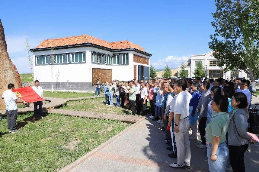 5月18日下午,实践团第一站来到中哈边境的小白杨哨所,开展沉浸式主题党课。通过161团退伍老兵管述军的介绍和实地参观小白杨哨所展览馆,实践团成员了解了小白杨的故事,被边防战士和一代代兵团人为国戍边、不畏牺牲、奉献青春的事迹感动。在邢晓凯的领誓下,全体党员教师举起右拳,重温入党誓词,再忆入党初心。