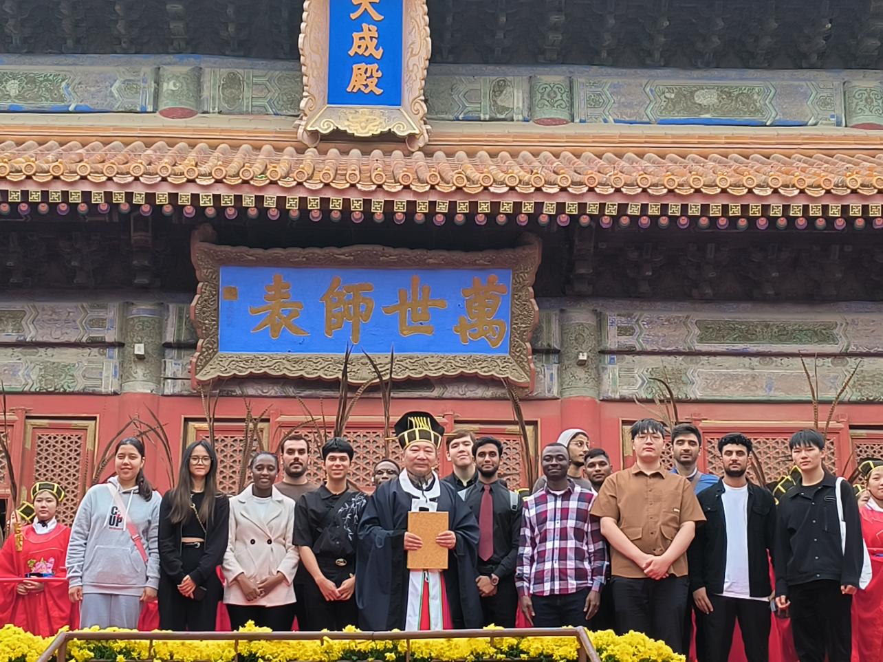 9月28日,来自土库曼斯坦、哈萨克斯坦、孟加拉国等九个国家的来华留学生代表前往北京市孔庙和国子监博物馆参加第2575届祭孔大典,现场学习了中国传统四拜礼,观赏了《礼记》诗篇的吟诵和六佾舞的表演,感受到了儒家思想和中国传统建筑、礼仪、舞蹈、诗词文化的独特魅力。
