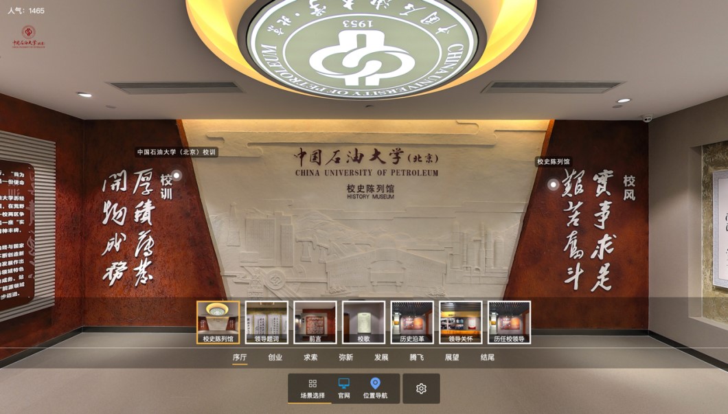 网上校史馆跨越了时空限制,从“漫游校史馆”“主题校史馆”“校史记忆”“校史影像”“校史问答”“留影校史”六个版块对校史陈列馆的馆藏内容进行展示。“漫游校史馆”“主题校史馆”分别从展厅全景、展厅细节完整呈现了实体校史馆“创业厅”“求索厅”“弥新厅”“发展厅”“腾飞厅”以及序厅和尾厅的内容,通过全景影像技术导览系统,实现了虚拟人物漫游同校史图片、展陈文字、智能语音讲解、视频宣传片等展示形式的有机结合。参观者可以自由选择展厅,VR模式随时切换,以漫游视角获得身临其境的参观体验。“校史记忆”通过图文形式梳理了学校发展脉络,从宏观角度展示学校发展历程,为参观者增添富有特色的校史记忆;“校史影像”展播体现我国石油行业发展和学校校史校情的宣传视频,以生动的方式讲述石油历史,宣传石油文化,弘扬中石大精神;“校史问答”分为知识库和答题两个模块,参观者可以在知识库分门别类地掌握自己感兴趣的校史知识,在答题模块检验学习效果,在互动中增进对校史校情的了解;“留影校史”选取了校园标志性景观图片,参观者可以选择喜欢的校园风景,与自己的人物照片“合影”,留下美好的校园回忆,实现“云留影”。