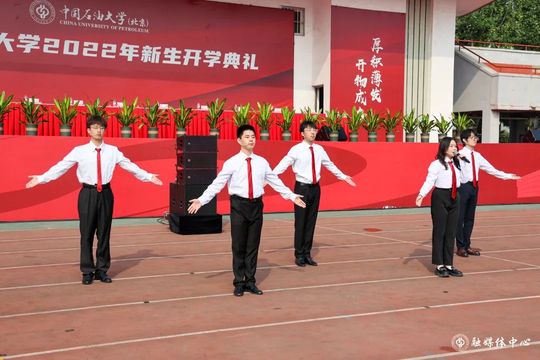今年的开学典礼设置了暖场表演、新生佩戴校徽、新生入学宣誓等环节,为中石大的“新主人”们打造了特殊的入学仪式。“青春逢其时,能源定未来。”来自大学生艺术团的同学们饱含深情的朗诵勾勒出一代代石油人艰苦创业、矢志奋斗的身影,欢快悦动的歌舞彰显出中石大新青年们青春勃发的力量。