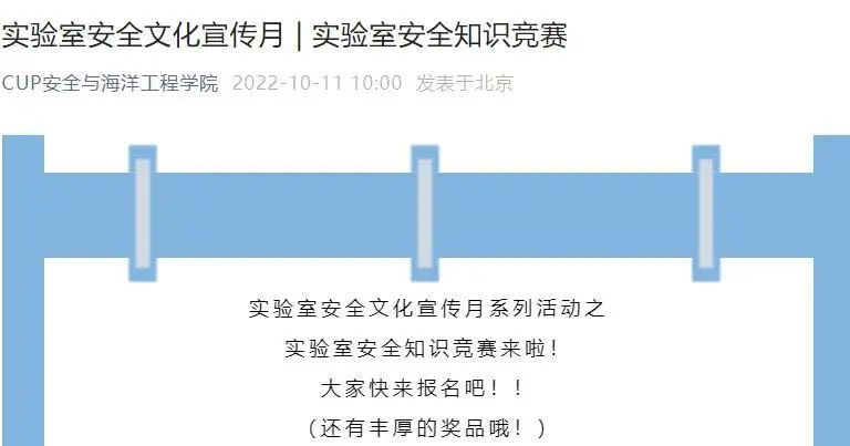 为贯彻落实党中央、国务院、教育部关于安全工作的决策部署,以更高标准、更严要求、更实作风,全力以赴抓好实验室安全工作,10月,中石大开展“实验室安全文化宣传月”系列活动,在2022级新生入校后这个时间节点,通过一系列宣传教育活动建设实验室安全文化,提升师生安全素养,牢固树立实验室安全理念。