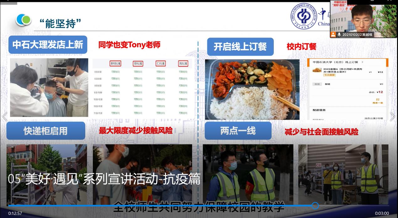 为进一步增强学生疫情防控意识,防止出现麻痹思想、厌战情绪、侥幸心理、松劲心态,切实承担起疫情防控的个人责任,学生工作处将疫情防控教育作为重要内容纳入新生入学教育,帮助新生学习了解学校疫情防控政策措施;在面向新生开展的“美好·遇见”系列宣讲活动中设置抗疫篇专题,讲述中石大抗疫故事,引导学生主动担当,积极参与配合疫情防控工作;统一部署9月学生主题班会,面向全体学生介绍最新疫情形势,讲解学校开学初疫情防控要求,提醒返校途中和到校后注意事项等,教育学生毫不松劲共同筑牢校园疫情防线。