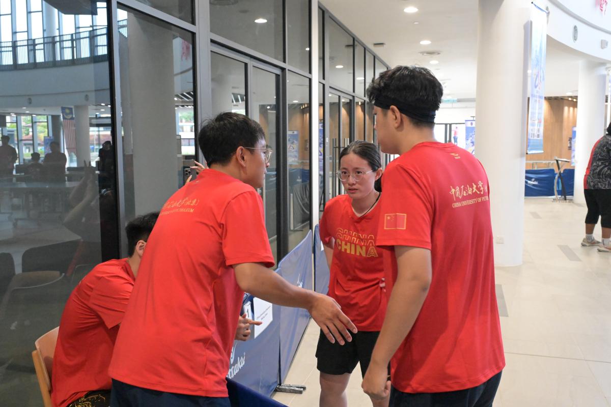 在为期两天的比赛中,中石大体育代表团顽强拼搏,斩获佳绩,其中羽毛球队在参加的5场团体比赛中获得全胜,取得该项目冠军;足球队以2:0战胜马来西亚高校足球强队,以0:0逼平菲律宾高校代表队;乒乓球队以大比分战胜泰国、菲律宾代表队。