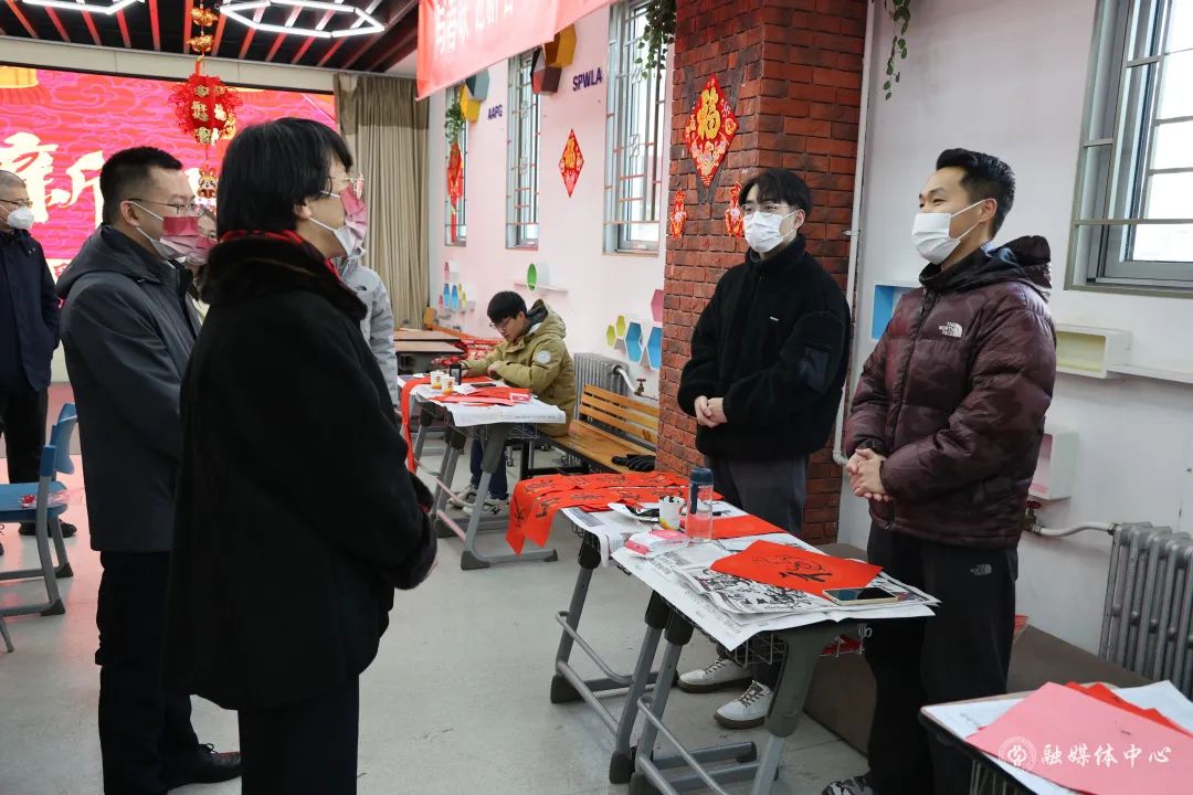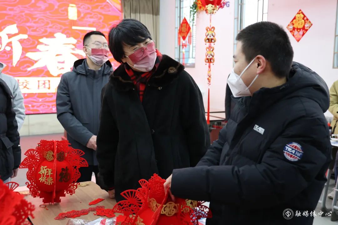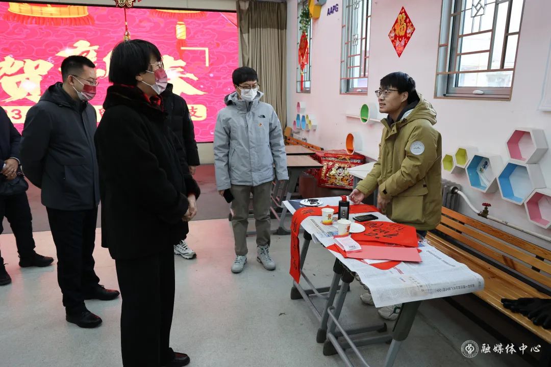 在学生活动中心,同学们正在写春联、做灯笼,忙得不亦乐乎,在欢声笑语中喜迎新春。化学工程与环境学院2020级博士生罗佳庆、经济管理学院2022级硕士生张泽宸正在写春联,他们跟吴小林分享了虎年的收获、假期的打算和兔年的规划,地球物理学院2020级本科生孔志伟告诉吴小林自己要在学校好好准备英语考试,吴小林鼓励大家合理安排假期生活,努力学习、强身健体,德智体美劳全面发展,做有格调、有情操,对社会有贡献的人。