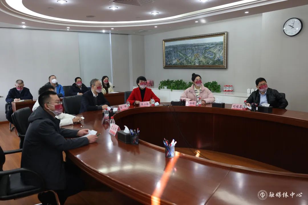 陈峰、吴小林、文永红、刘植昌一行在主楼A1502会议室,与留校学生家长、返乡学生代表视频连线。