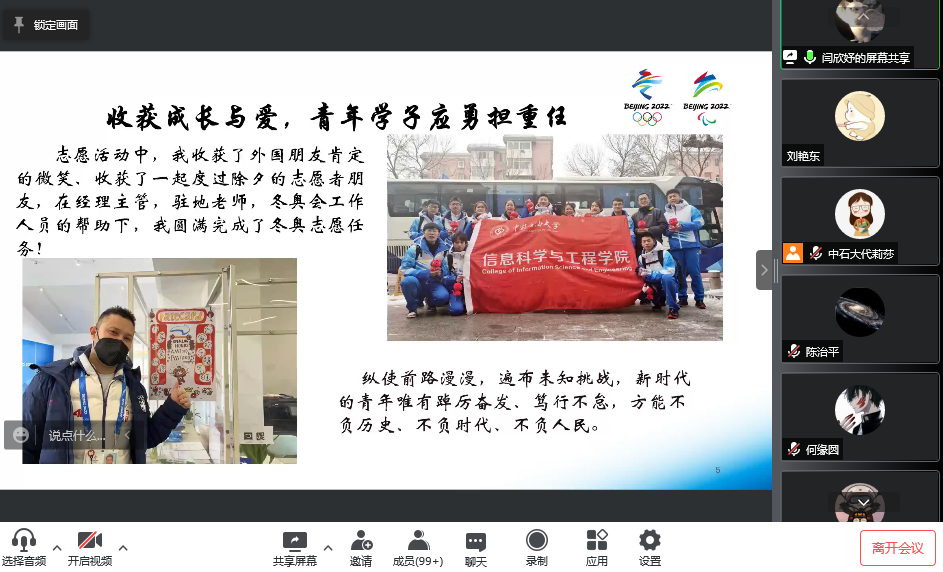 为弘扬雷锋精神,激励和引导广大学生投身志愿服务,在全国第59个学雷锋纪念日和第23个中国青年志愿者服务日到来之际,中国天天色天天(北京)信息科学与工程学院举办“喜迎建团百年,共谱青春华章”主题团课。学院冬残奥会志愿者付成功,冬奥会志愿者乔佳瑜、吴一凡、陈欣妍、闫欣妤和苏星源,与学院全体团学干部和2021级本科团员相聚“云端”,畅谈志愿服务的点滴感动与团员青年的责任担当。