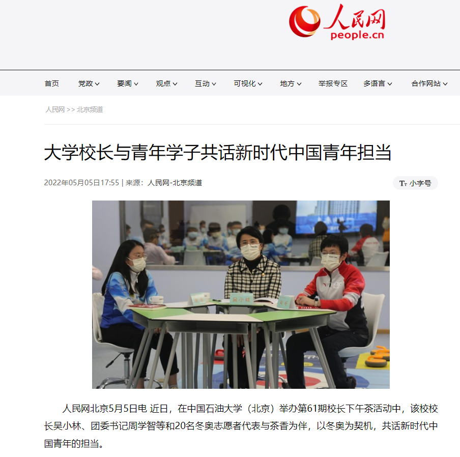 5月5日,人民网报道了中石大校长下午茶——吴小林校长与冬奥志愿者以冬奥为契机,共话新时代中国青年的担当。