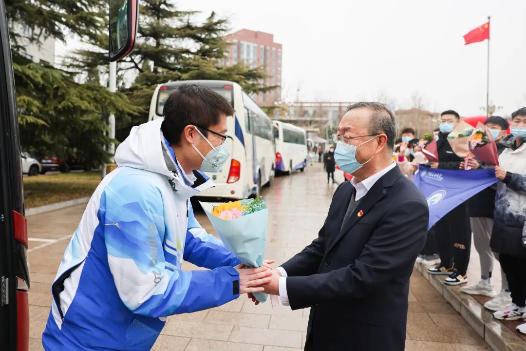 陈峰向归来的志愿者表示亲切问候,他说,在这堂冰雪上的“大思政课”中,中石大志愿者践行了“请党放心,冬奥有我”的铮铮誓言,是“最有执行力、最有战斗力、最有爱国情、最有荣校志”的中石大青年代表。他表示,同学们生逢其时,能够服务冬奥会、冬残奥会很幸运,希望同学们带着这份收获和荣耀,在未来的人生道路上谱写更多精彩华章。