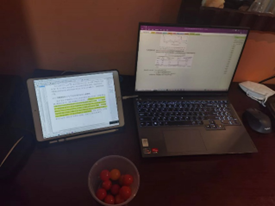 虽然志愿服务很忙碌,丁拼搏依然没有耽误正常的工作。分发早餐完成后,他马上转换身份,在某个学术会议上作了线上报告。