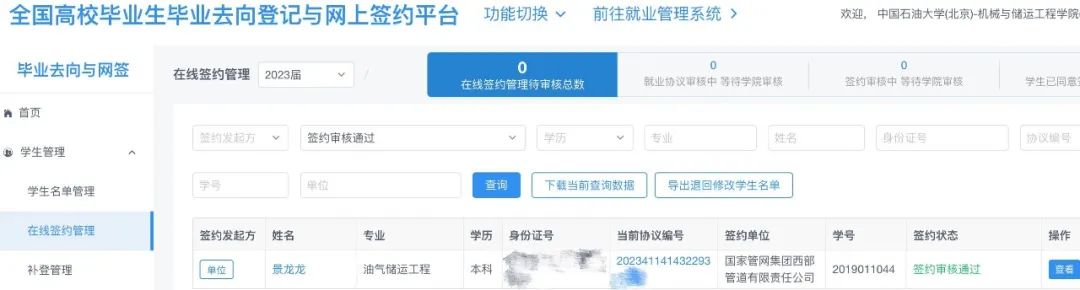 忙着找工作的同学们也没闲着。油气储运工程专业2019级本科生景龙龙怀揣着建设西部的梦想,投递了很多西部的单位,最终在一百多名面试者中脱颖而出,被国家管网集团西部管道有限责任公司录用,也成为了学院第一个使用网签系统的同学。
