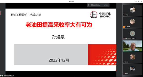 孙焕泉院士以“老油田提高采收率大有可为”为主题,针对我国复杂老油田面临的诸多挑战,结合现场工程实践,介绍了我国取得的理论技术创新与进展,并勉励同学们以非常规理念,利用智能化技术,在油气行业绿色低碳发展道路上大有可为。