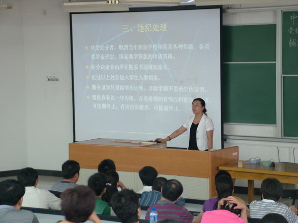 王娟首先向新生家长们介绍了各专业的辅导员,并强调了家长与学校沟通的重要性。随后,王娟简述了化工学院的概况:学院发展的历史,各硬件设施,学科优势,教师和学生规模状况,重点提出了本科教学的总体思路:厚基础、宽专业、强能力;以及学院发展目标:创国内一流专业,培养具有竞争力的合格人才。之后,王娟又向新生和家长们介绍了关于学分制、助学贷款、违纪处理、免试保研及转专业的9大方面的热点问题。会议中,王娟反复强调了“大学并不是终点,而是一个全新的起点!”这一理念,希望各位新生抓住大学四年,充满意义的度过自己宝贵的青春。