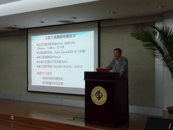 许厚泽教授主要就大地测量探测技术在资源勘探、环境变化及灾害监测中的应用作了详细介绍与阐述。报告中,他以多个实例向同学们介绍了全球卫星导航系统GNSS、卫星测高系统、冰卫星测高技术 Icesat、合成孔径雷达干涉系统 InSar、重力卫星系统 CHAMP、GRACE、GOCE等一系列世界领先的大地测量探测技术,将世界最前沿的测绘测量信息直观的展现在我校师生面前。
