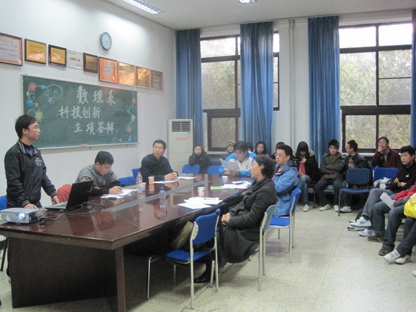 115下午1530,数理系在系会议室举行了第十批科技创新立项答辩评审会,本次评审会特邀请发展与改革委员所所长肖磊老师、物理教研室副主任张万松老师以及物理教研室钟寿仙教授出任评委,对申报课题进行评议和审核。