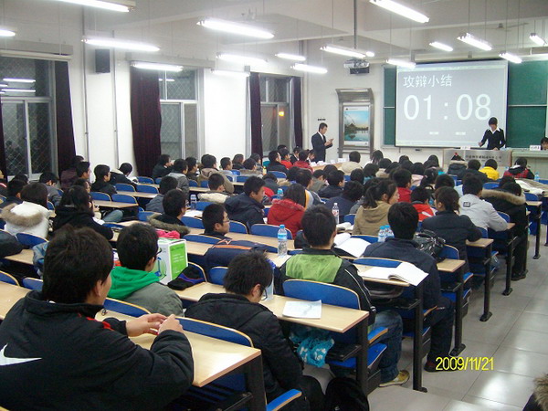 在决赛开始前,刘凌老师对此次学风月辩论赛举办的意义及学风建设的重要性做了简明扼要的阐述,并对参加本次比赛的选手、评委、工作人员及到场观众表示感谢。决赛持续了近一个小时,正反双方围绕“学风建设主要靠自我约束还是学校管理”展开激烈辩论,经过激烈的唇枪舌战,最终正方07级二队夺得冠军,反方 08级二队获得亚军,最佳辩手为反方四辩曹扬同学。