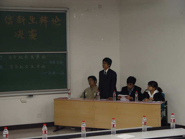 地质09创新班和环科09-1班分别针对“当今社会生男好”和“当今社会生女好”的话题展开辩论。一路坎坷的地质09创新班在经历奇迹复活并且前一场爆冷淘汰地质09-3班后,在决赛中表现的很积极主动,向对手连番发难;相比之下,之前所向披靡的环科09-1班则表现得稍显逊色。这场决赛的成功举办也给新生辩论赛画上了圆满的句号。