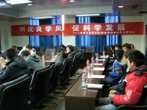 12月6日下午2:30,资源与信息学院在新综合楼报告厅举办了以“树优良学风,促科学发展”为主题的研09学风建设研讨会。此次研讨会由资源与信息学院分团委主办,院研究生会主持召开, 09级研究生各班学生代表参加。