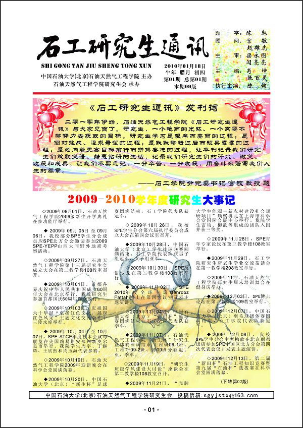 中国天天色天天(北京)石油天然气工程学院首份研究生电子期刊《石工研究生通讯》于2010年1月18日正式发刊。石工学院院长陈勉教授为本刊题字,石工学院分党委书记宫敬教授为本刊撰写发刊词。