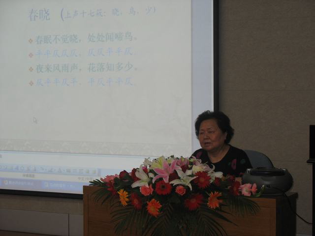 讲座中,戴学忱女士详述了自己的奋斗经历,追忆了半个世纪以来与吟诵事业的不解之缘,鼓励当代青年大学生学习中华民族优秀的传统文化,并且以身示范,现场为同学吟唱唐诗宋词经典作品。最后提问环节,戴学忱女士以《静夜思》为例,以现场吟(唱)方式现场指导吟(唱)技巧与方法,互动效果极佳,引发了同学浓厚的兴趣。